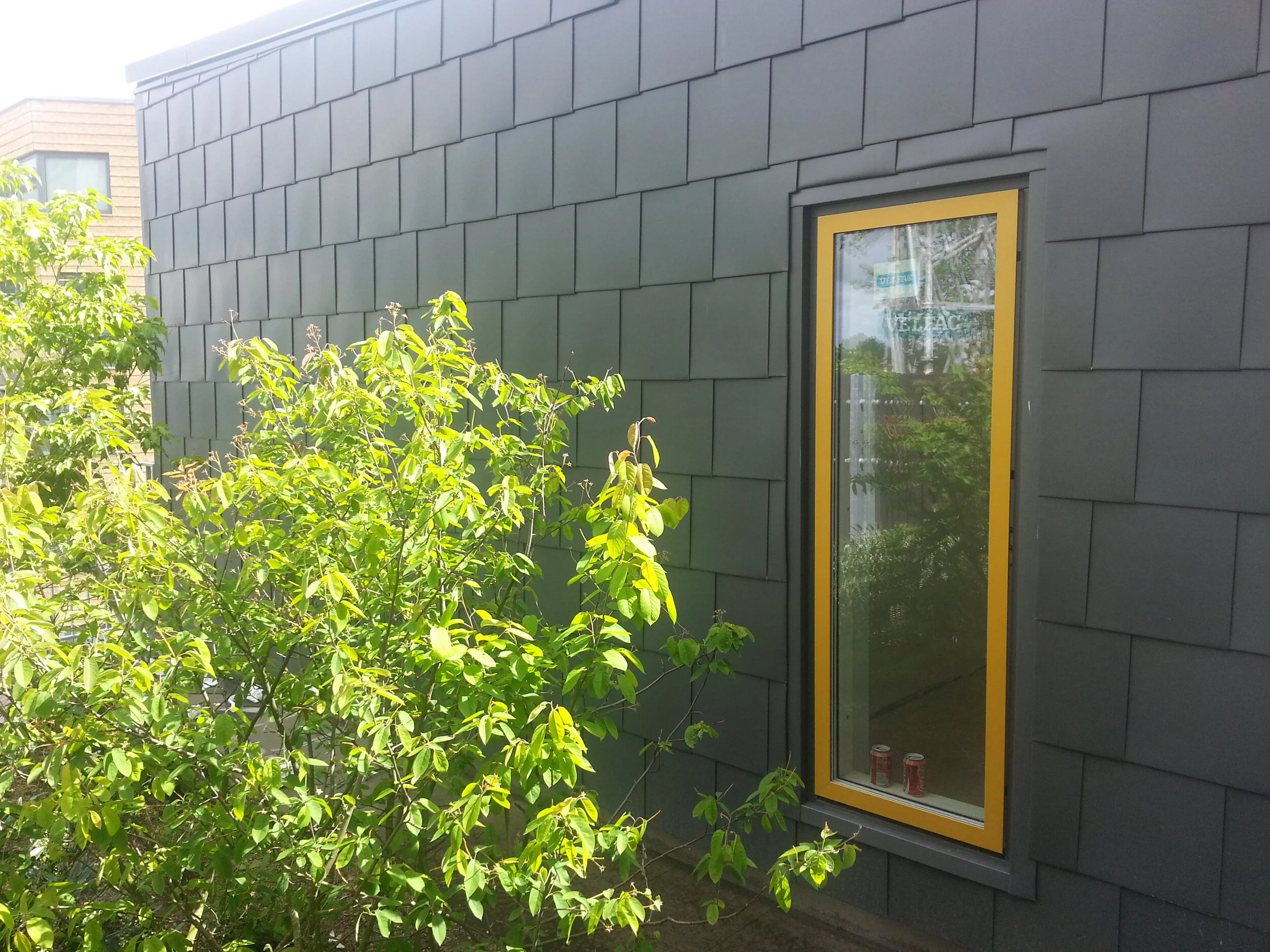 Fasadmaterialet på de låga byggnaderna är i huvudsak Rheinzink prePatina, kulör graphite grey. Små kvadratiska formatplåtar med tydlig skuggverkan ger fasaden dess speciella karaktär. Vid entréerna är fasaden klädd med cederträ för att ge gården ett mjukt och varmt uttryck. Takmaterialet består av sedumväxter som ger ett omväxlande intryck allt efter årstidsväxlingar. Dessa gröna tak uppskattas från de befintliga lägenheterna högre upp i området.